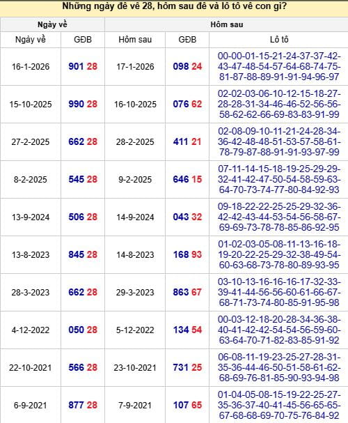 Dựa vào bảng dữ liệu lịch sử các ngày có kết quả giải đặc biệt là 28, chúng ta có thể thấy những quy luật chuyển động rất rõ ràng của các con số. Việc thống kê này giúp trả lời câu hỏi đề về 28 hôm sau ra con gì một cách khách quan thay vì chỉ dựa vào phán đoán cảm tính.
